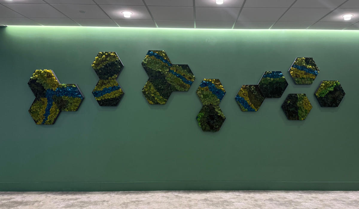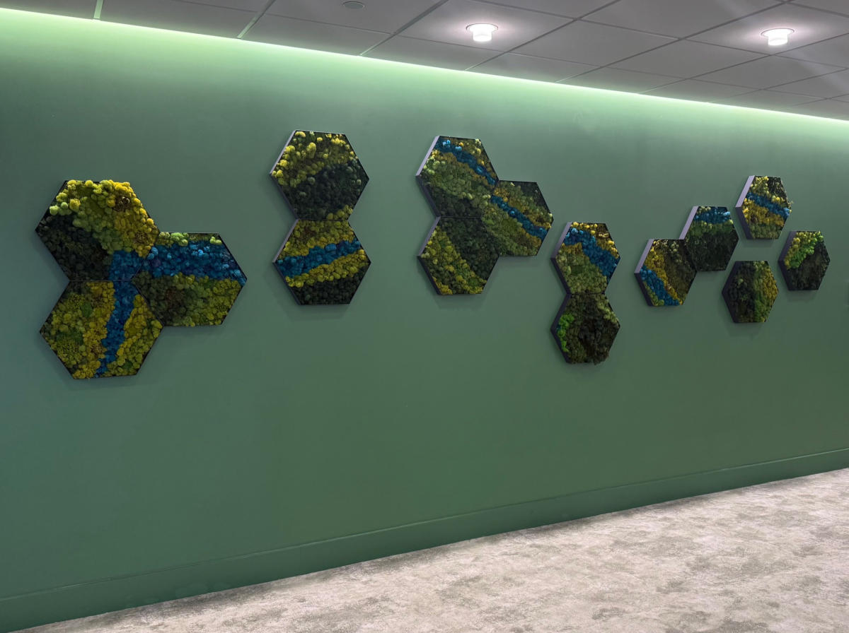Each section of the green wall is inspired by the distinct qualities of Dayton’s five rivers. The flowing movement of the moss evokes the rippling currents of these waterways, while their varying shades of green reflect the diversity of plant life found along the riverbanks. The preserved moss acts as a living testament to the organic landscapes of the region, offering a moment of pause amidst the steel and concrete of the city, inviting both reflection and reconnection with the natural world.